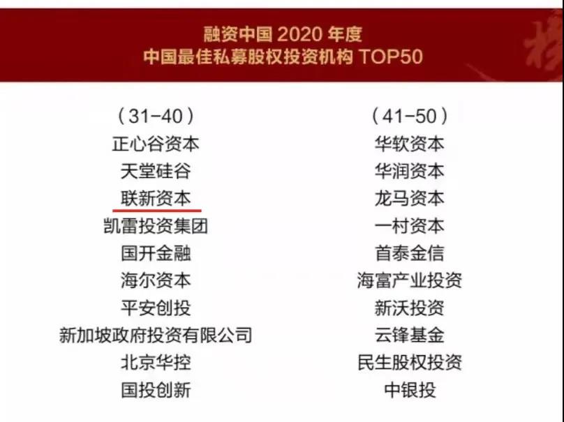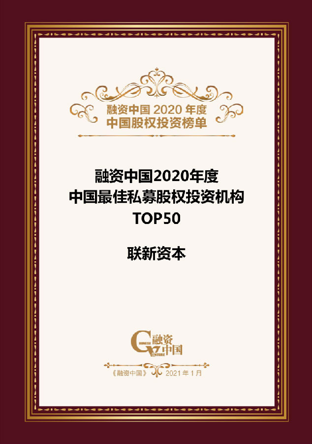 1月13-14日,由融資中國(guó)主辦的“平凡的榮耀”融資中國(guó)第十屆資本年會(huì)在上海舉行,會(huì)上正式發(fā)布2020年度股權(quán)投資領(lǐng)域九大綜合榜單。聯(lián)新資本再次獲評(píng)“2020年度中國(guó)最佳私募股權(quán)投資機(jī)構(gòu)TOP50”。